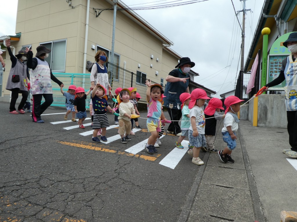 誘導ロープを握って保育園近くの”トトロの森”までお散歩に行きました