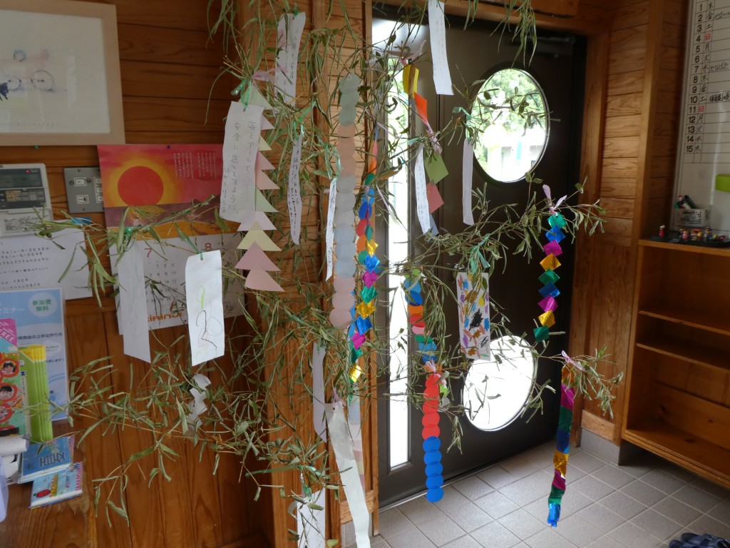 センターの入り口にも笹の葉がおいてあって、みんなのおねがいごとがかざってあります![]()