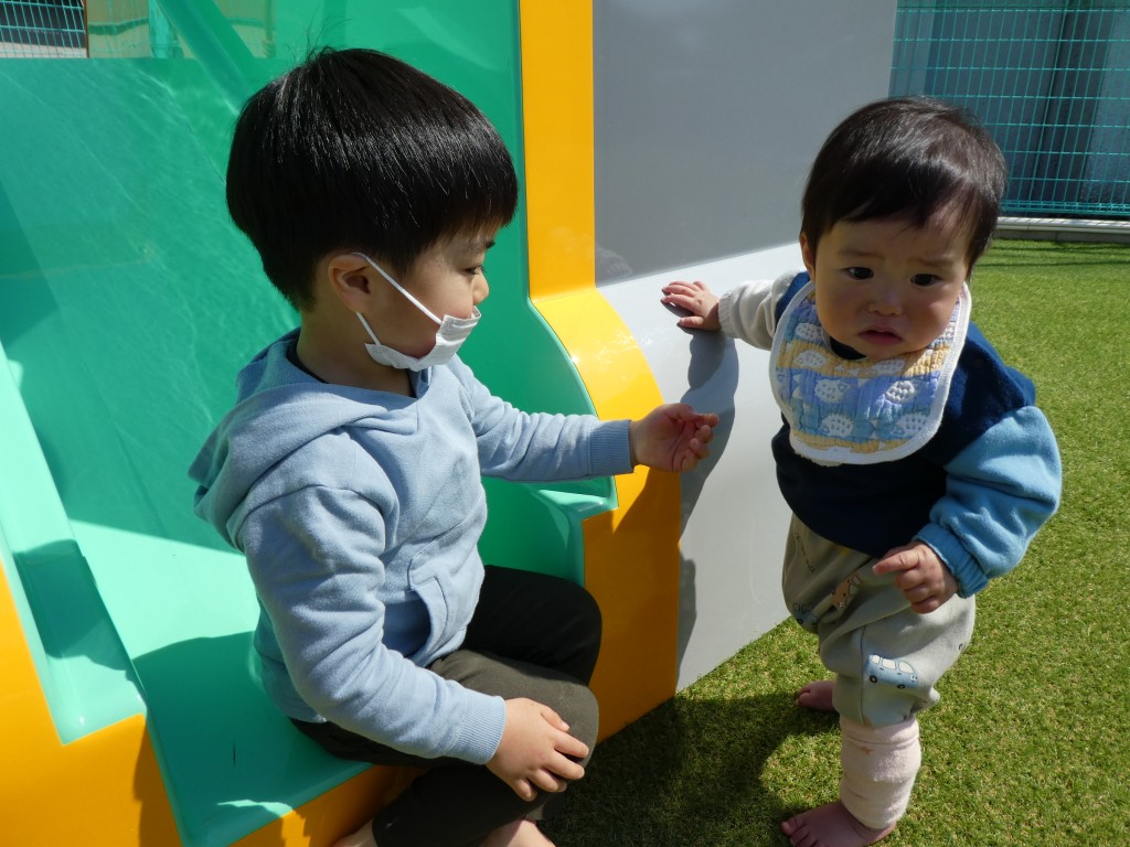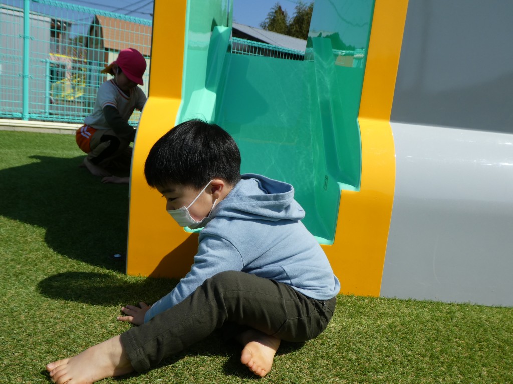 センターで遊んだ後に、保育園の園庭に新しく入ったショベルカーのすべり台で遊びました