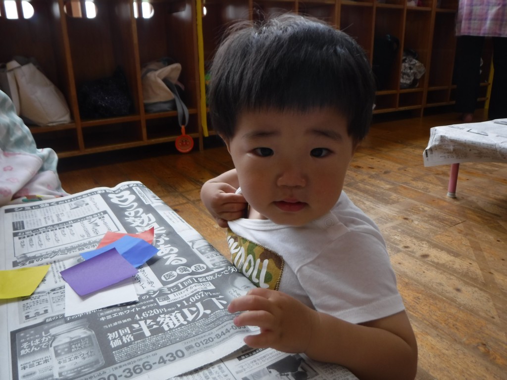 保育園で初めてのりを使い、べたッとした感触に笑ったり、少し困ったりといろいろな表情をみせるお友だちでした