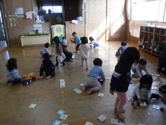 「消防車」「救急車」「ミキサー車」「タクシー」「ケーキ」「うさぎ」などそれぞれの車の名前やカードに書いてある絵の名前を言ったりしながら遊んでいましたよ