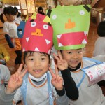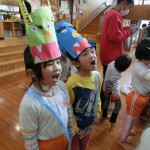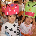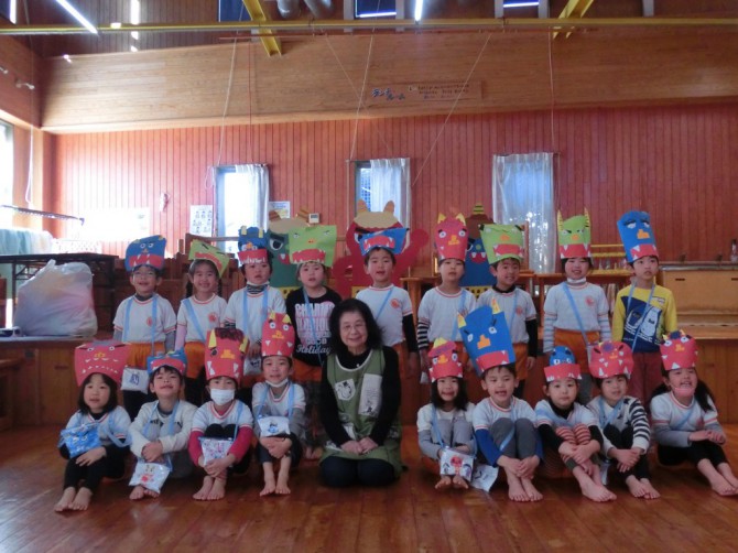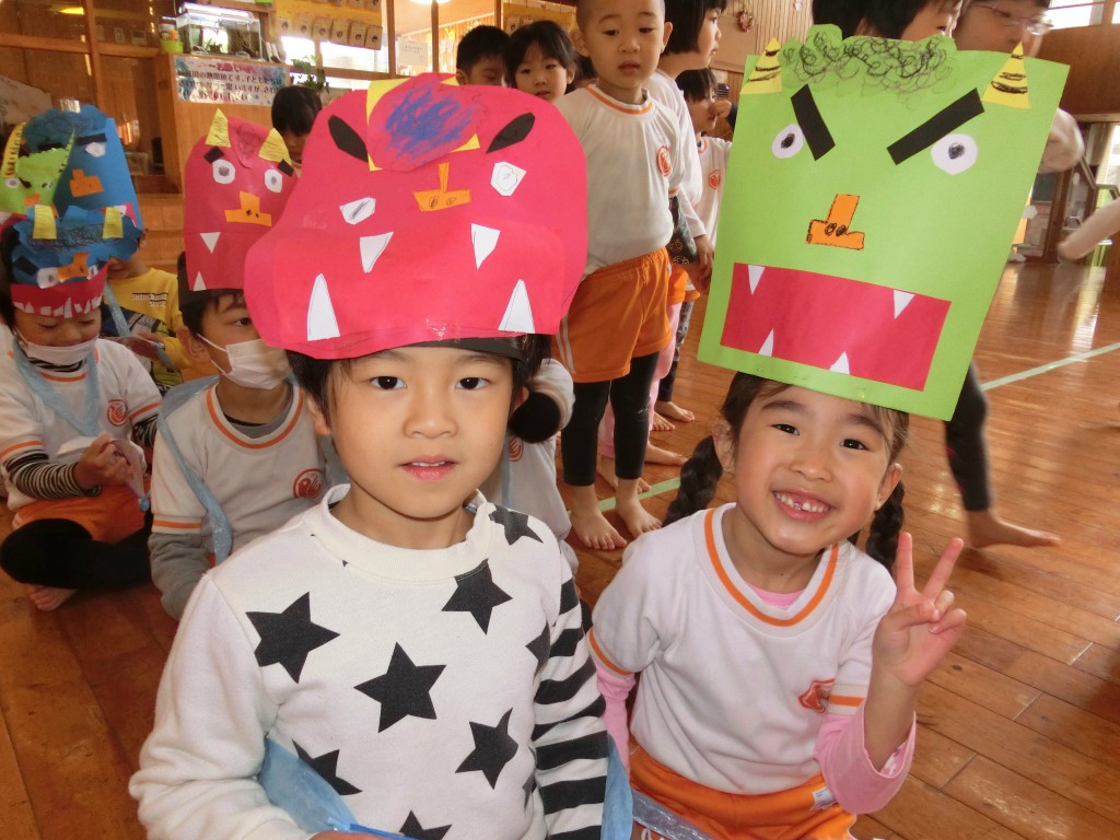 節分会では鬼のお面と豆入れの作品を発表してから、ゲームと豆まきに参加しました![]()