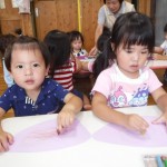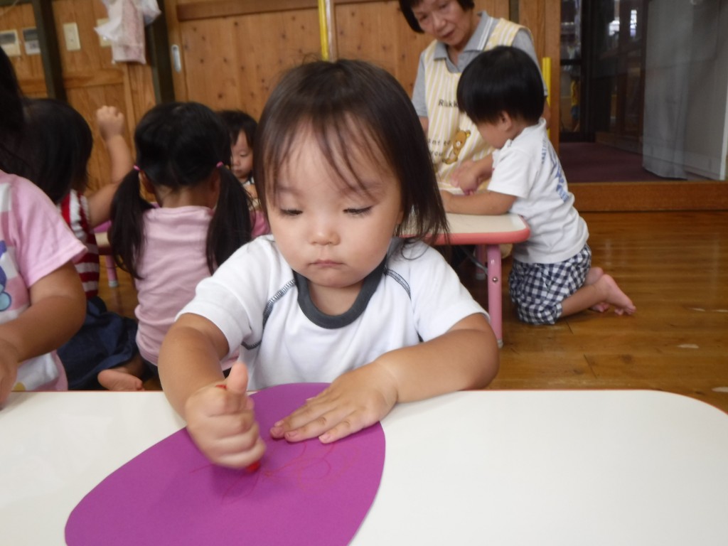 ぶどうの形の画用紙に自分でクレヨンを使ってお絵描きをしました
