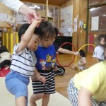 マットで作った丘を越えたり、跳び箱をジャンプしたり、はいはいでフラフープくぐりをしました
