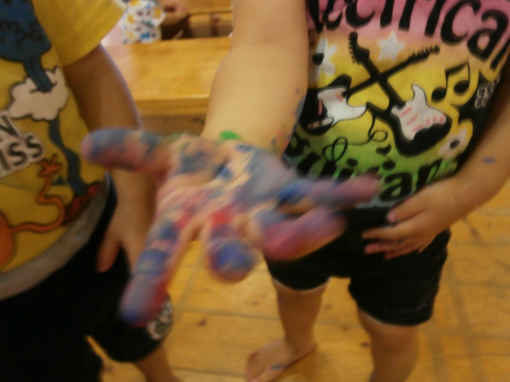夏のやさいのナス、オクラ、ピーマン、ニガウリを絵の具に付けてペタペタ・・・・