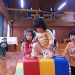 ホールをつっかて、マット、跳び箱、フープ、ボールなどで遊んだり、