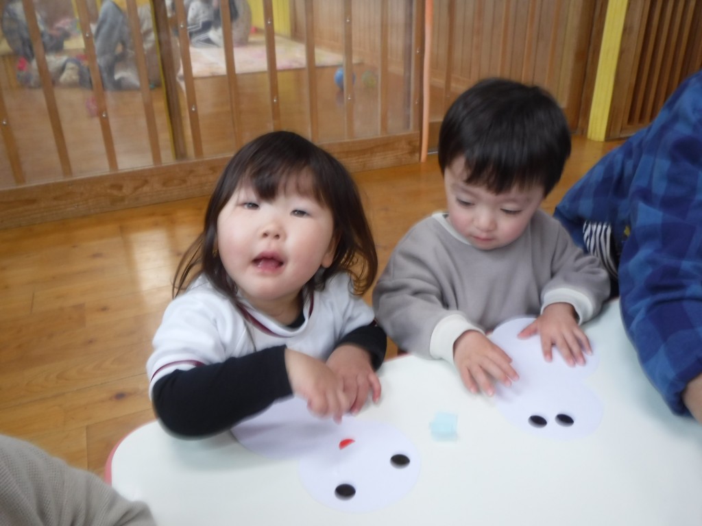 雪だるまやこまの製作をしました。雪だるまは、シールや色画用紙で顔などかわいく