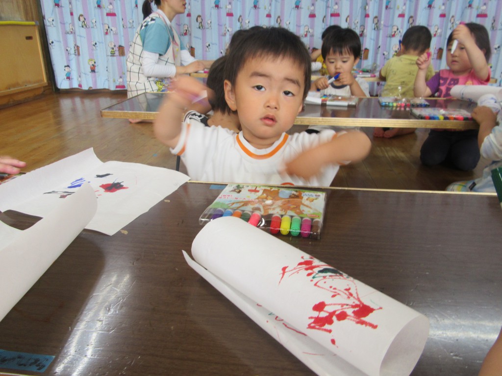 模様を描いた後、霧吹きでにじみ絵にしました。
